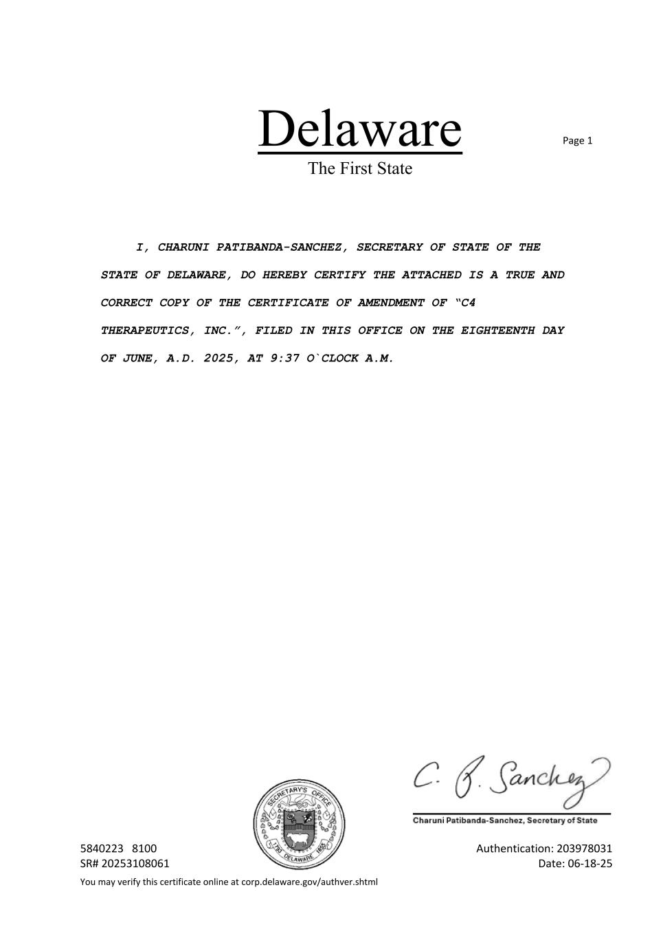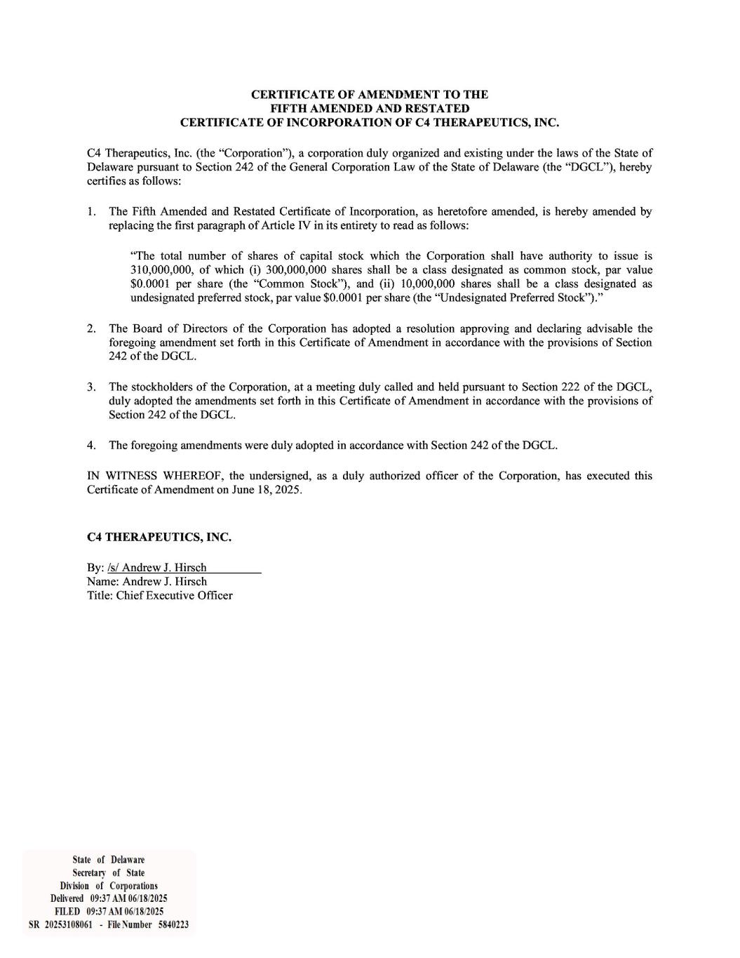 On June 18, 2025, C4 Therapeutics, Inc. (the “Company”) held its Annual Meeting of Stockholders (the “Annual Meeting”). As further described in Item 5.07 to this Current Report on Form 8-K, at the Annual Meeting, the Company’s stockholders approved an amendment to the Company’s Fifth Amended and Restated Certificate of Incorporation to increase the number of authorized shares of common stock from 150,000,000 to 300,000,000. On June 18, 2025, the Company filed a Certificate of Amendment to the Company’s Fifth Amended and Restated Certificate of Incorporation (the “Certificate of Amendment”) with the Secretary of State of the State of Delaware and the Certificate of Amendment became effective on filing. The foregoing description does not purport to be complete and is qualified in its entirety by reference to the full text of the Certificate of Amendment, a copy of which is filed as Exhibit 3.1 to this Current Report on Form 8-K and incorporated herein by reference.