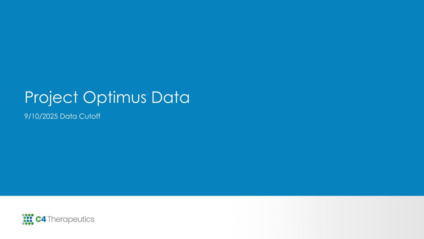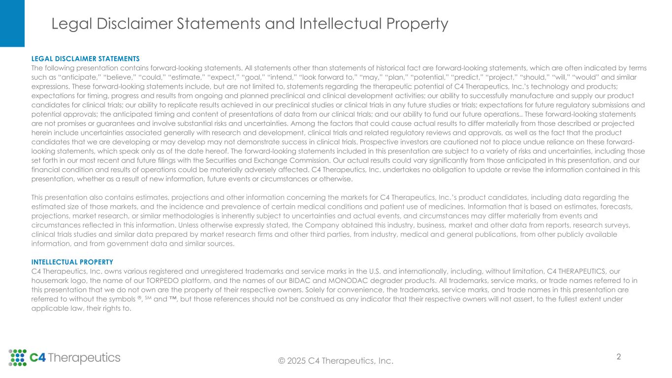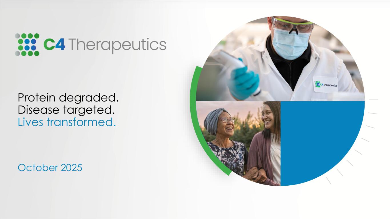 Legal Disclaimer Statements and Intellectual Property LEGAL DISCLAIMER STATEMENTS The following presentation contains forward-looking statements. All statements other than statements of historical fact are forward-looking statements, which are often indicated by terms such as “anticipate,” “believe,” “could,” “estimate,” “expect,” “goal,” “intend,” “look forward to,” “may,” “plan,” “potential,” “predict,” “project,” “should,” “will,” “would” and similar expressions. These forward-looking statements include, but are not limited to, statements regarding the therapeutic potential of C4 Therapeutics, Inc.’s technology and products; expectations for timing, progress and results from ongoing and planned preclinical and clinical development activities; our ability to successfully manufacture and supply our product candidates for clinical trials; our ability to replicate results achieved in our preclinical studies or clinical trials in any future studies or trials; expectations for future regulatory submissions and potential approvals; the anticipated timing and content of presentations of data from our clinical trials; and our ability to fund our future operations.. These forward-looking statements are not promises or guarantees and involve substantial risks and uncertainties. Among the factors that could cause actual results to differ materially from those described or projected herein include uncertainties associated generally with research and development, clinical trials and related regulatory reviews and approvals, as well as the fact that the product candidates that we are developing or may develop may not demonstrate success in clinical trials. Prospective investors are cautioned not to place undue reliance on these forward- looking statements, which speak only as of the date hereof. The forward-looking statements included in this presentation are subject to a variety of risks and uncertainties, including those set forth in our most recent and future filings with the Securities and Exchange Commission. Our actual results could vary significantly from those anticipated in this presentation, and our financial condition and results of operations could be materially adversely affected. C4 Therapeutics, Inc. undertakes no obligation to update or revise the information contained in this presentation, whether as a result of new information, future events or circumstances or otherwise. This presentation also contains estimates, projections and other information concerning the markets for C4 Therapeutics, Inc.’s product candidates, including data regarding the estimated size of those markets, and the incidence and prevalence of certain medical conditions and patient use of medicines. Information that is based on estimates, forecasts, projections, market research, or similar methodologies is inherently subject to uncertainties and actual events, and circumstances may differ materially from events and circumstances reflected in this information. Unless otherwise expressly stated, the Company obtained this industry, business, market and other data from reports, research surveys, clinical trials studies and similar data prepared by market research firms and other third parties, from industry, medical and general publications, from other publicly available information, and from government data and similar sources. INTELLECTUAL PROPERTY C4 Therapeutics, Inc. owns various registered and unregistered trademarks and service marks in the U.S. and internationally, including, without limitation, C4 THERAPEUTICS, our housemark logo, the name of our TORPEDO platform, and the names of our BIDAC and MONODAC degrader products. All trademarks, service marks, or trade names referred to in this presentation that we do not own are the property of their respective owners. Solely for convenience, the trademarks, service marks, and trade names in this presentation are referred to without the symbols ®, SM and , but those references should not be construed as any indicator that their respective owners will not assert, to the fullest extent under applicable law, their rights to. 2 © 2025 C4 Therapeutics, Inc.