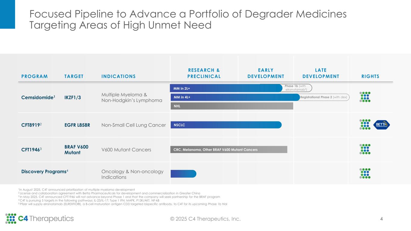 C4T Is Positioned to Unlock Value Across the Portfolio © 2025 C4 Therapeutics, Inc. Source: 1 Health Advances (2022), ClearView (2023), and C4T analysis, opportunity across two market segments – 2L+ with BCMA BiTE and 4L+ with dexamethasone 2 Collaboration with Merck will conclude in late November 2025 Unlocking the clinical potential of a class-leading IKZF1/3 degrader and quickly delivering on an optimized portfolio of degraders against novel targets to address sizeable indications of unmet need Deliver value from high-potential clinical programs Build upon ~10 years of experience developing degraders against multiple target classes • Advance a new portfolio of novel targets in non-oncology and oncology indications with the potential for multiple development candidates Continue our established collaborations in oncology and non-oncology2 • Expand application of targeted protein degradation through high-value collaborations • Advance cemsidomide to realize its potential as an IKZF1/3 degrader with class-leading efficacy and a differentiated safety & tolerability profile with potential $2.5B-$4B1 peak revenue for label opportunities • Utilize CFT8919 Phase 1 data to determine next steps 3