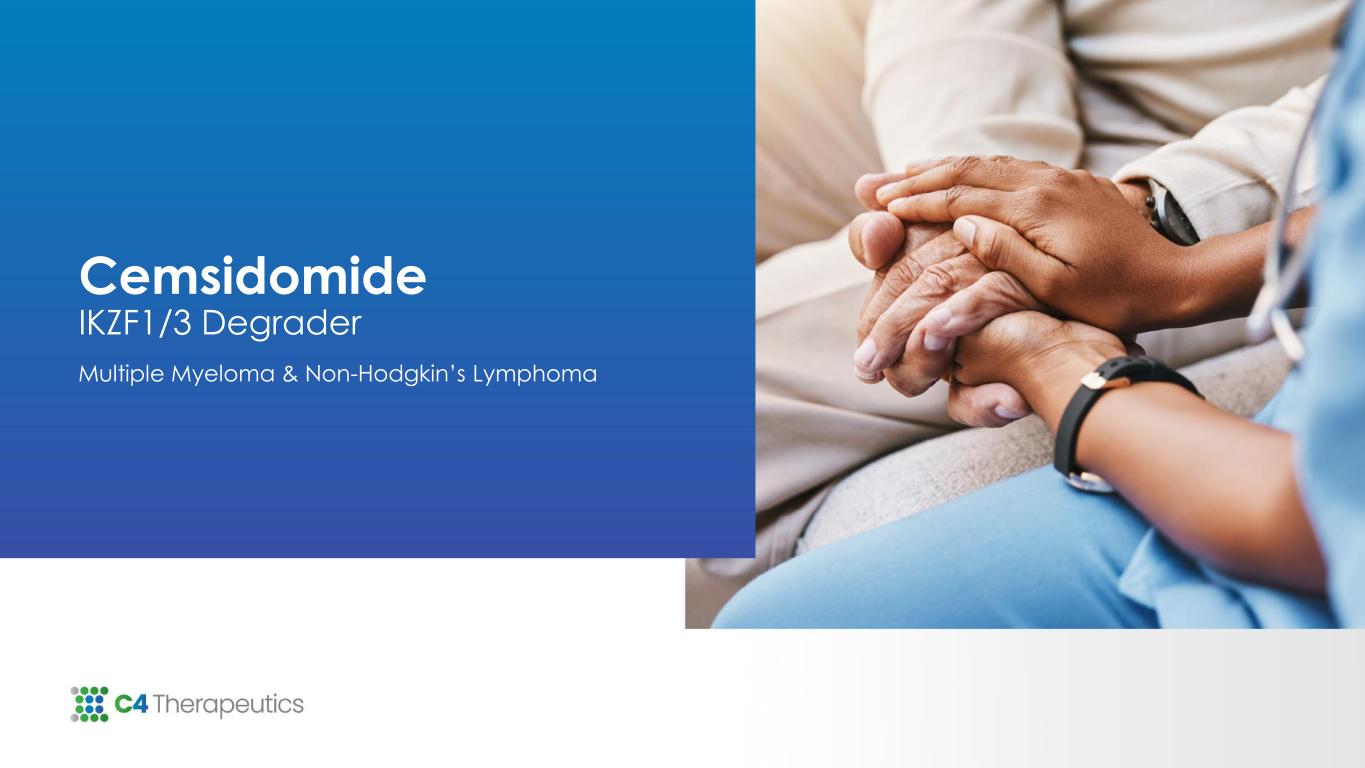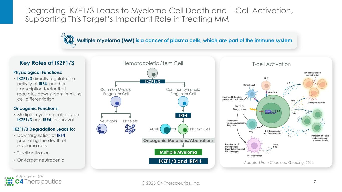 Degrading IKZF1/3 Leads to Myeloma Cell Death and T-Cell Activation, Supporting This Target’s Important Role in Treating MM © 2025 C4 Therapeutics, Inc. Multiple myeloma (MM) Common Myeloid Progenitor Cell Common Lymphoid Progenitor Cell Neutrophil Platelets B-Cell Plasma Cell Oncogenic Mutations/Aberrations IKZF1/3 and IRF4 Multiple Myeloma IRF4 Physiological Functions: • IKZF1/3 directly regulate the activity of IRF4, another transcription factor that regulates downstream immune cell differentiation Oncogenic Functions: • Multiple myeloma cells rely on IKZF1/3 and IRF4 for survival IKZF1/3 Degradation Leads to: • Downregulation of IRF4 promoting the death of myeloma cells • T-cell activation • On-target neutropenia Key Roles of IKZF1/3 IKZF1/3 Hematopoietic Stem Cell Multiple myeloma (MM) is a cancer of plasma cells, which are part of the immune system T-cell Activation Adapted from Chen and Gooding, 2022 IKZF1/3 Degrader 7