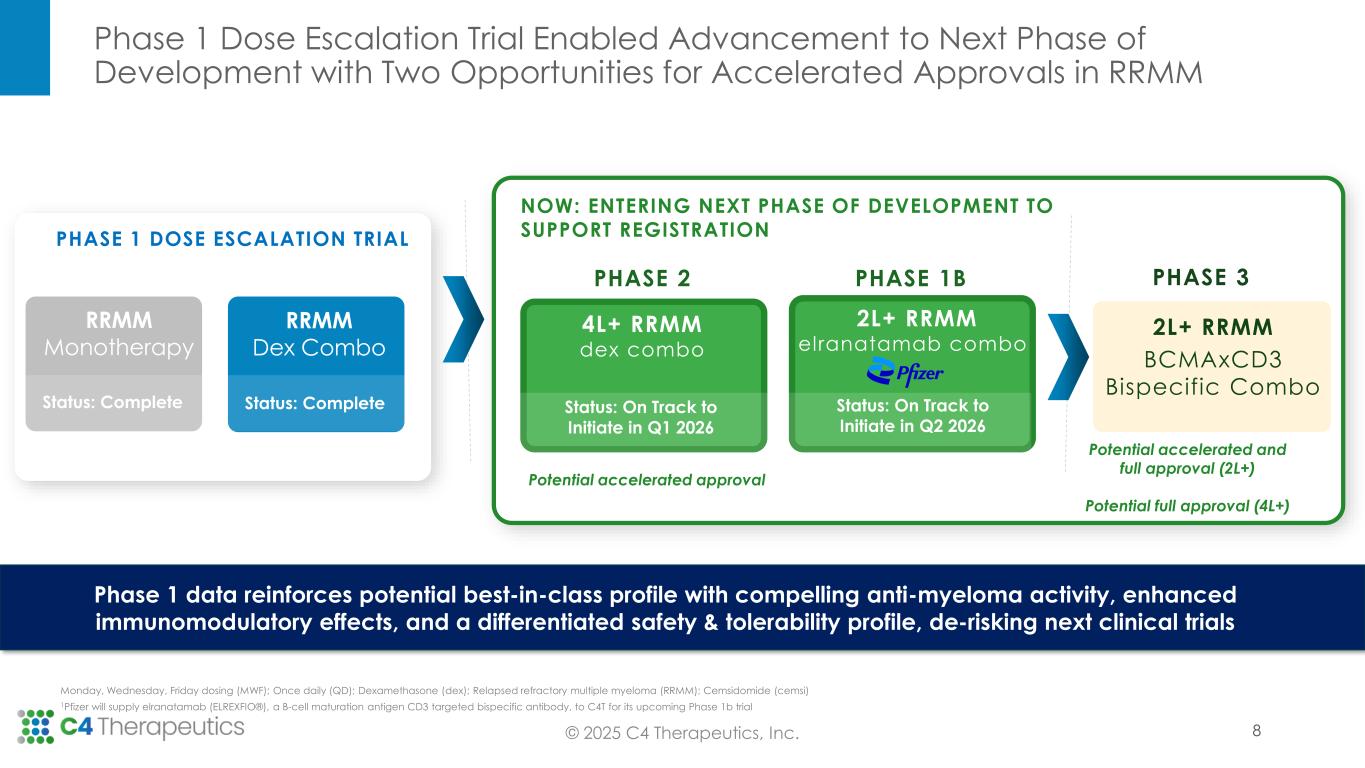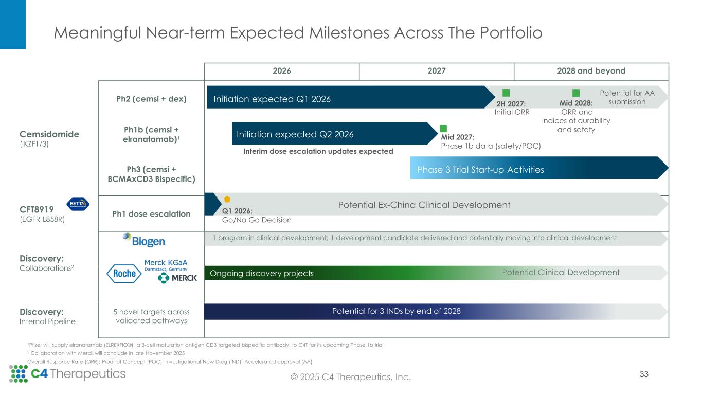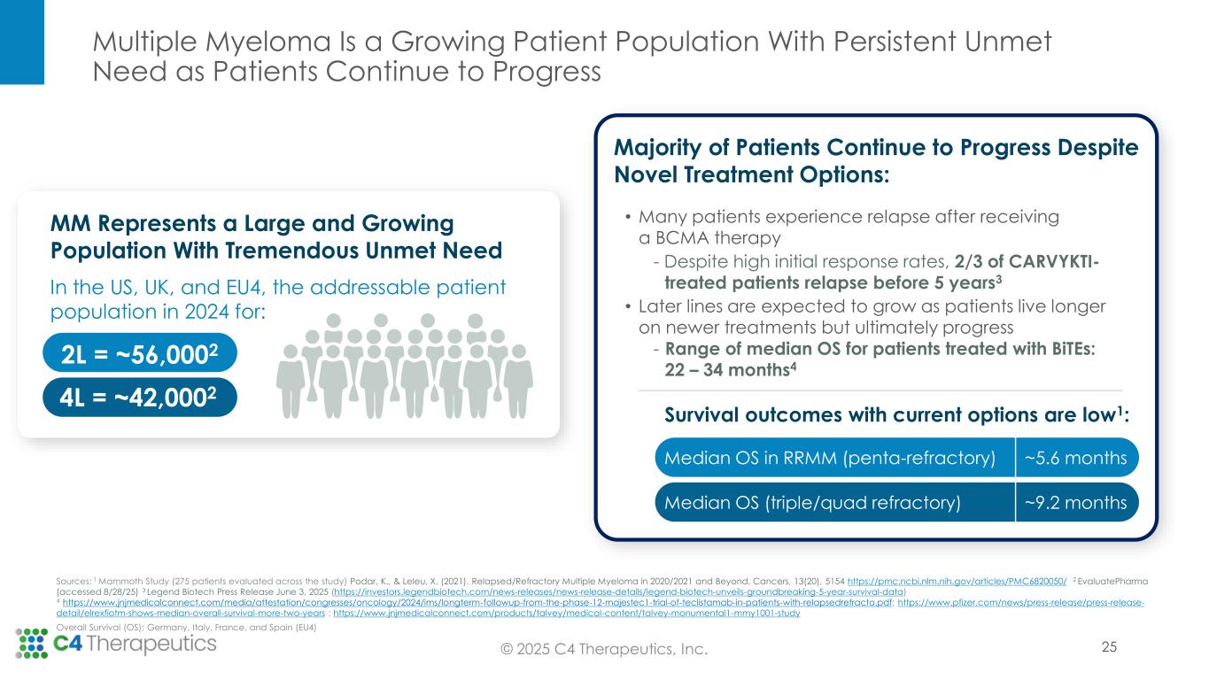 Cemsidomide Development Plan Provides Efficient Path to Registration and Addresses a Growing Patient Population © 2025 C4 Therapeutics, Inc. A single, randomized controlled Phase 3 study would be used to support accelerated approval in 2L+ and full approval in 2L+ and 4L+ based on a time-to-event endpoint Accelerated Approval Full Approval 4L or later Phase 2 (Single Arm) Cemsi + dex ORR endpoint N= ~100 Time-to-event endpoint 2L or later Phase 1b Cemsi + elranatamab1 Characterize safety and tolerability N = 30 - 50 ORR endpoint Phase 2 trial de-risked based on Phase 1 dose escalation data Phase 3 Cemsi + BCMAxCD3 Bispecific Q1 2026 Initiation: Q2 2026 Initiation: 2 trials pave way for 2 distinct potential accelerated approvals based on ORR endpoint = next trial initiations 24Overall response rate (ORR); Dexamethasone (dex) 1Pfizer will supply elranatamab (ELREXFIO®), a B-cell maturation antigen CD3 targeted bispecific antibody, to C4T for its upcoming Phase 1b trial