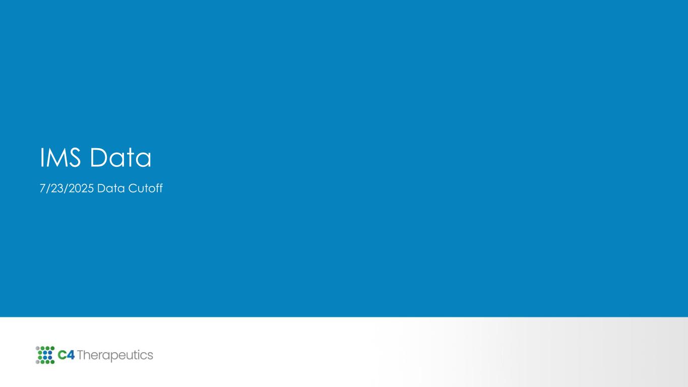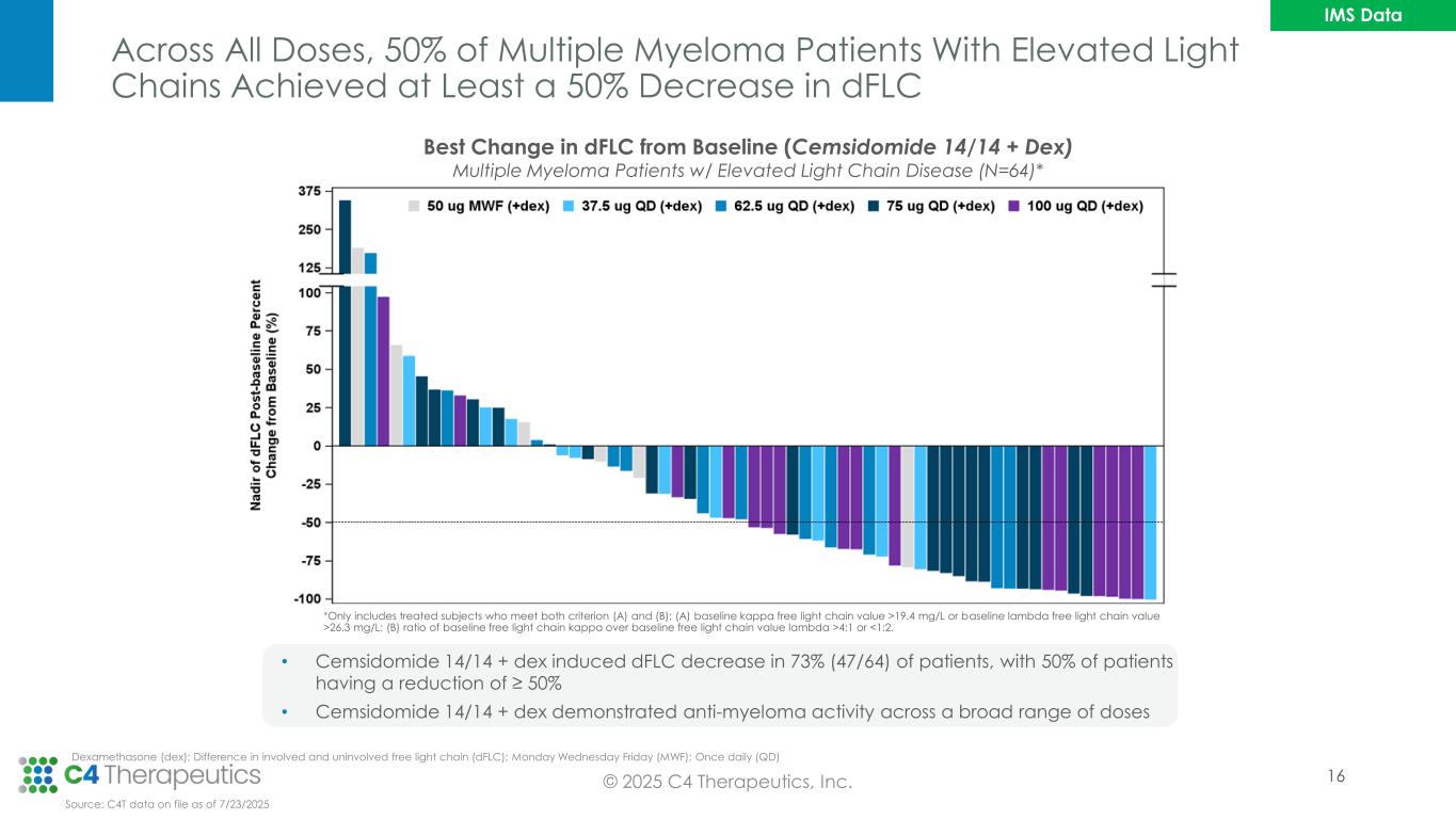 Exposure (AUC) Quartiles <Q1 (N=14) Q1-Q2 (N=14) Q2-Q3 (N=14) >Q3 (N=14) Mean AUC0-28d (ng*h/mL) 16.8 34.9 51.9 103.3 Mean Change in dFLC from Baseline +10% -11% -31% -52% Cemsidomide 100 µg Dose Level Drives Sufficient Exposure, Resulting in Meaningful Reductions in Light Chains 15 Cemsidomide + dex PK Exposure vs. dFLC Change *Includes 56 patients with abnormal baseline sFLC defined as (A) kappa FLC >19.4 mg/L or lambda FLC >26.3 mg/L and (B) kappa-to-lambda FLC ratio >4 or <0.5. Area under the curve (AUC); Dexamethasone (dex); Difference in involved and uninvolved free light chain (dFLC,); Maximum response (Emax); Monday Wednesday Friday dosing (MWF); Once daily (QD); Population pharmacokinetics (popPK); Pharmacokinetic (PK) 0 40 80 120 160 200 -100% -50% 0% 50% 100% 150% 350% PopPK-derived AUC0-28d (ngh/mL) % d F L C C h n a g e f ro m B a s e li n e 50 μg MWF (N=6) 37.5 μg QD (N=11) 62.5 μg QD (N=12) 75 μg QD (N=19) 100 μg QD (N=8) Emax Model Fit * Source: C4T data on file as of 7/23/2025 © 2025 C4 Therapeutics, Inc. IMS Data
