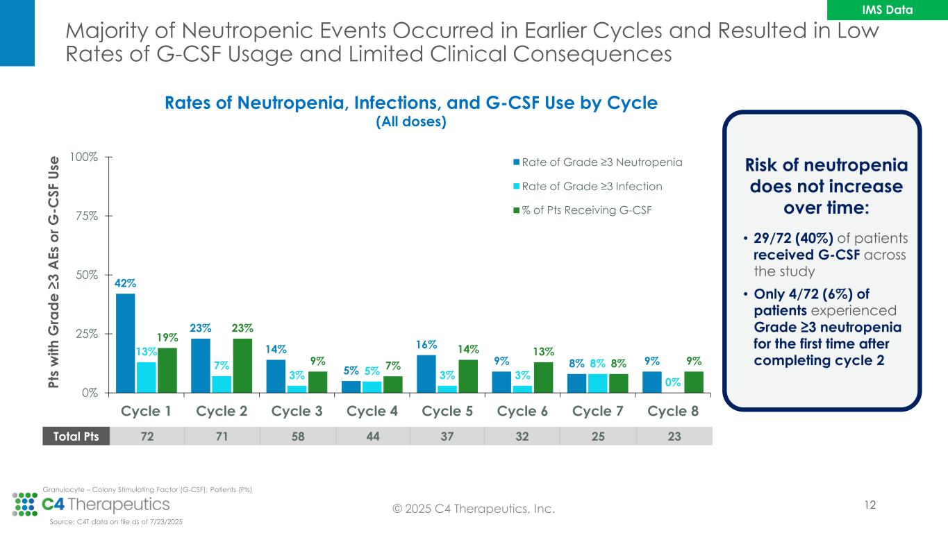Cemsidomide Demonstrated a Differentiated Tolerability Profile With Minimal Dose Reductions and Discontinuations © 2025 C4 Therapeutics, Inc. Minimal Dose Reductions • TEAEs leading to dose reductions: 4/72 (6%)1 No Discontinuations Related to Cemsidomide • 1 TEAE led to discontinuation, unrelated to cemsidomide2 1 Dose Reductions: 1 patient at 75 µg had grade 4 thrombocytopenia possibly related to cemsidomide resulting in dose reduction; A patient at 100 µg had grade 3 pneumonia and another patient at 100 µg had grade 3 neutropenia, both possibly related to cemsidomide and resulting in dose reduction; a patient at 100 µg had two dose reductions after two events of pseudomonal bacteremia, deemed unrelated to cemsidomide 2 Patient at 75 µg discontinued due to grade 5 AE of septic shock, deemed unrelated to cemsidomide * 2 patients experienced grade 5 AEs (septic shock and subdural hematoma), both deemed unrelated to cemsidomide Treatment emergent adverse events (TEAEs) Common (>20% All Grades) TEAEs and Events of Interest, n (%) All Grades (N=72) Grade 3 (N=72) Grade 4 (N=72) Grade 5* (N=72) Neutropenia 44 (61) 17 (24) 24 (33) 0 Infections Pneumonia Upper Respiratory Tract Infection Septic Shock Sepsis 42 (58) 10 (14) 10 (14) 1 (1) 2 (3) 17 (24) 9 (13) 2 (3) 0 2 (3) 0 0 0 0 0 1 (1) 0 0 1 (1) 0 Anemia 27 (38) 16 (22) 1 (1) 0 Fatigue 26 (36) 0 0 0 Diarrhea 26 (36) 1 (1) 0 0 Leukopenia 21 (29) 9 (13) 8 (11) 0 Thrombocytopenia 14 (19) 5 (7) 3 (4) 0 Lymphopenia 13 (18) 6 (8) 2 (3) 0 Febrile Neutropenia 4 (6) 3 (4) 1 (1) 0 Source: C4T data on file as of 7/23/2025 11 IMS Data