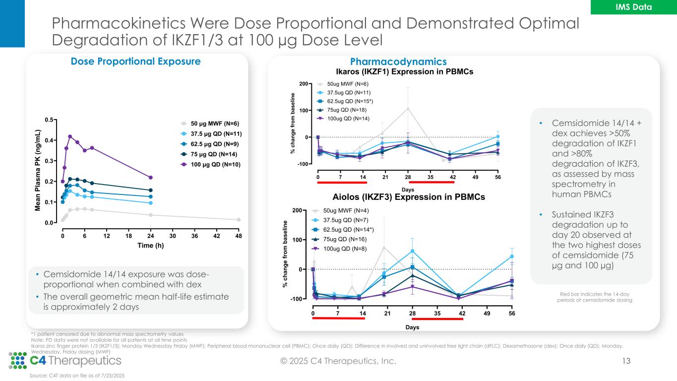Majority of Neutropenic Events Occurred in Earlier Cycles and Resulted in Low Rates of G-CSF Usage and Limited Clinical Consequences © 2025 C4 Therapeutics, Inc. 42% 23% 14% 5% 16% 9% 8% 9% 13% 7% 3% 5% 3% 3% 8% 0% 19% 23% 9% 7% 14% 13% 8% 9% 0% 25% 50% 75% 100% Cycle 1 Cycle 2 Cycle 3 Cycle 4 Cycle 5 Cycle 6 Cycle 7 Cycle 8 P ts w it h G ra d e ≥ 3 A E s o r G -C S F U se Rate of Grade ≥3 Neutropenia Rate of Grade ≥3 Infection % of Pts Receiving G-CSF Rates of Neutropenia, Infections, and G-CSF Use by Cycle (All doses) Total Pts 72 71 58 44 37 32 25 23 Risk of neutropenia does not increase over time: • 29/72 (40%) of patients received G-CSF across the study • Only 4/72 (6%) of patients experienced Grade ≥3 neutropenia for the first time after completing cycle 2 Source: C4T data on file as of 7/23/2025 Granulocyte – Colony Stimulating Factor (G-CSF); Patients (Pts) IMS Data 12