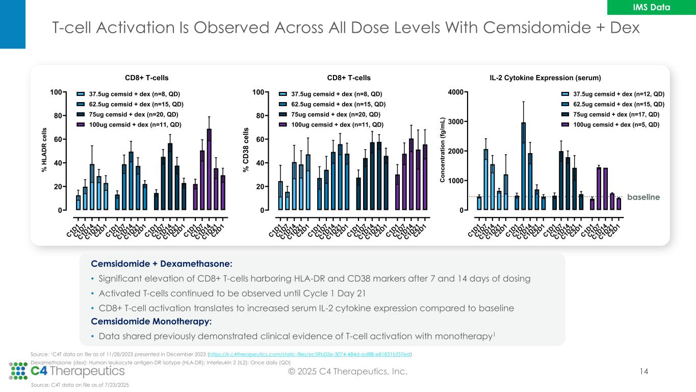 Pharmacokinetics Were Dose Proportional and Demonstrated Optimal Degradation of IKZF1/3 at 100 µg Dose Level 13 *1 patient censored due to abnormal mass spectrometry values Note: PD data were not available for all patients at all time points Ikaros zinc finger protein 1/3 (IKZF1/3); Monday Wednesday Friday (MWF); Peripheral blood mononuclear cell (PBMC); Once daily (QD); Difference in involved and uninvolved free light chain (dFLC); Dexamethasone (dex); Once daily (QD); Monday, Wednesday, Friday dosing (MWF) • Cemsidomide 14/14 exposure was dose- proportional when combined with dex • The overall geometric mean half-life estimate is approximately 2 days Dose Proportional Exposure 0 6 12 18 24 30 36 42 48 0.0 0.1 0.2 0.3 0.4 0.5 Time (h) M e a n P la s m a P K ( n g /m L ) 62.5 μg QD (N=9) 37.5 μg QD (N=11) 50 μg MWF (N=6) 75 μg QD (N=14) 100 μg QD (N=10) Source: C4T data on file as of 7/23/2025 • Cemsidomide 14/14 + dex achieves >50% degradation of IKZF1 and >80% degradation of IKZF3, as assessed by mass spectrometry in human PBMCs • Sustained IKZF3 degradation up to day 20 observed at the two highest doses of cemsidomide (75 µg and 100 µg) Pharmacodynamics 0 7 14 21 28 35 42 49 56 -100 0 100 200 Aiolos (IKZF3) Expression in PBMCs Days % c h a n g e f ro m b a s e li n e 100ug QD (N=8) 75ug QD (N=16) 62.5ug QD (N=14*) 37.5ug QD (N=7) 50ug MWF (N=4) 0 7 14 21 28 35 42 49 56 -100 0 100 200 Ikaros (IKZF1) Expression in PBMCs Days % c h a n g e f ro m b a s e li n e 37.5ug QD (N=11) 50ug MWF (N=6) 100ug QD (N=14) 75ug QD (N=18) 62.5ug QD (N=15*) Red bar indicates the 14-day periods of cemsidomide dosing © 2025 C4 Therapeutics, Inc. IMS Data