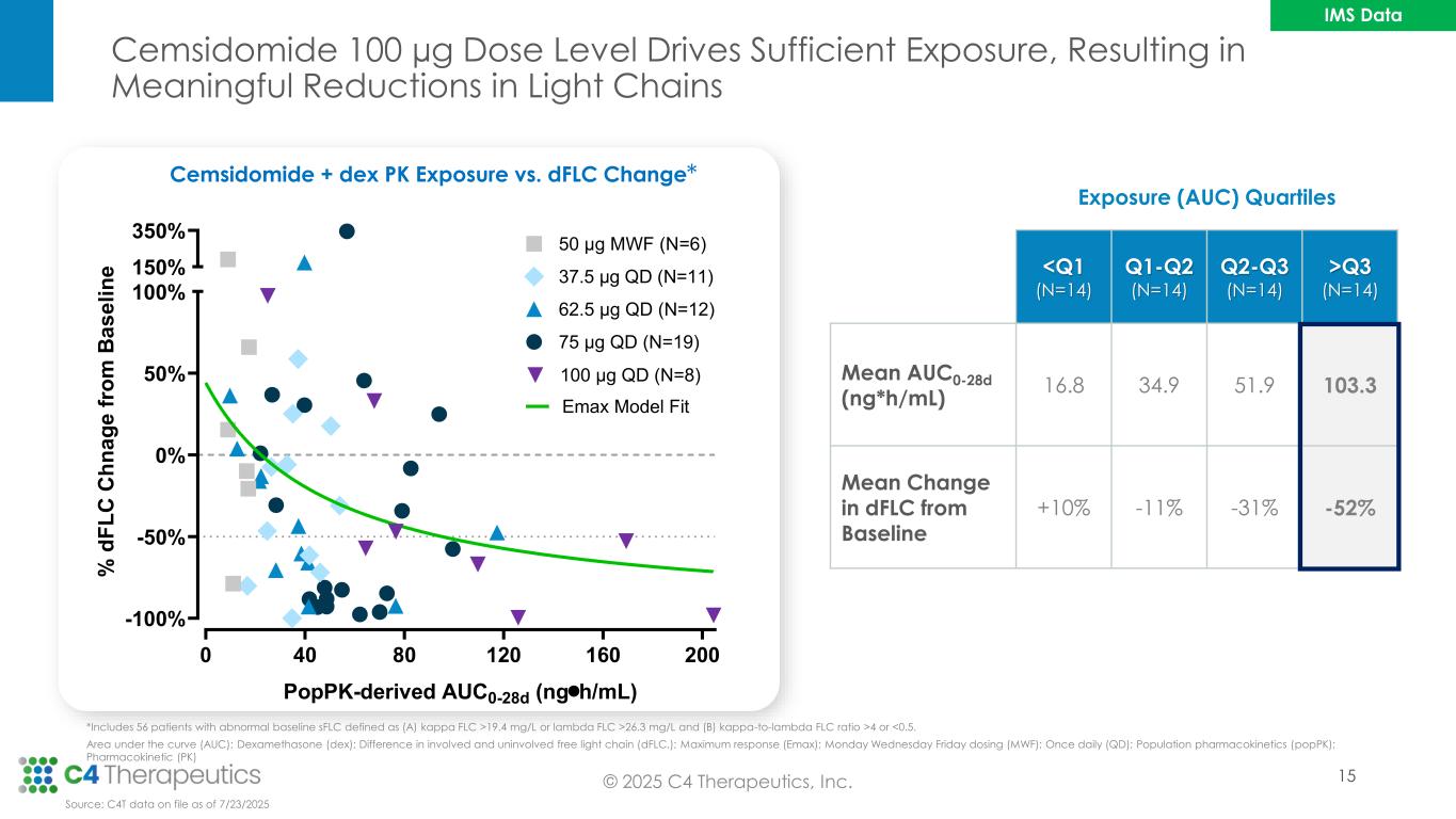 T-cell Activation Is Observed Across All Dose Levels With Cemsidomide + Dex © 2025 C4 Therapeutics, Inc. C 1D 1 C 1D 7 C 1D 14 C 1D 21 C 2D 1 C 1D 1 C 1D 7 C 1D 14 C 1D 21 C 2D 1 C 1D 1 C 1D 7 C 1D 14 C 1D 21 C 2D 1 C 1D 1 C 1D 7 C 1D 14 C 1D 21 C 2D 1 0 20 40 60 80 100 CD8+ T-cells % H L A D R c e ll s 37.5ug cemsid + dex (n=8, QD) 62.5ug cemsid + dex (n=15, QD) 75ug cemsid + dex (n=20, QD) 100ug cemsid + dex (n=11, QD) C 1D 1 C 1D 7 C 1D 14 C 1D 21 C 2D 1 C 1D 1 C 1D 7 C 1D 14 C 1D 21 C 2D 1 C 1D 1 C 1D 7 C 1D 14 C 1D 21 C 2D 1 C 1D 1 C 1D 7 C 1D 14 C 1D 21 C 2D 1 0 20 40 60 80 100 CD8+ T-cells % C D 3 8 c e ll s 37.5ug cemsid + dex (n=8, QD) 62.5ug cemsid + dex (n=15, QD) 75ug cemsid + dex (n=20, QD) 100ug cemsid + dex (n=11, QD) C 1D 1 C 1D 7 C 1D 14 C 1D 21 C 2D 1 C 1D 1 C 1D 7 C 1D 14 C 1D 21 C 2D 1 C 1D 1 C 1D 7 C 1D 14 C 1D 21 C 2D 1 C 1D 1 C 1D 7 C 1D 14 C 1D 21 C 2D 1 0 1000 2000 3000 4000 IL-2 Cytokine Expression (serum) C o n c e n tr a ti o n ( fg /m L ) 37.5ug cemsid + dex (n=12, QD) 62.5ug cemsid + dex (n=15, QD) 75ug cemsid + dex (n=17, QD) 100ug cemsid + dex (n=5, QD) Cemsidomide + Dexamethasone: • Significant elevation of CD8+ T-cells harboring HLA-DR and CD38 markers after 7 and 14 days of dosing • Activated T-cells continued to be observed until Cycle 1 Day 21 • CD8+ T-cell activation translates to increased serum IL-2 cytokine expression compared to baseline Source: C4T data on file as of 7/23/2025 baseline Cemsidomide Monotherapy: • Data shared previously demonstrated clinical evidence of T-cell activation with monotherapy1 Source: 1C4T data on file as of 11/28/2023 presented in December 2023 (https://ir.c4therapeutics.com/static-files/ec59b02e-3074-484d-ad88-e81831bf37ed) Dexamethasone (dex); Human leukocyte antigen-DR isotype (HLA-DR); Interleukin 2 (IL2); Once daily (QD) 14 IMS Data
