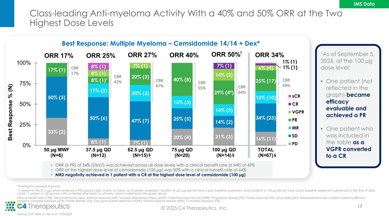 Across All Doses, 50% of Multiple Myeloma Patients With Elevated Light Chains Achieved at Least a 50% Decrease in dFLC © 2025 C4 Therapeutics, Inc. Dexamethasone (dex); Difference in involved and uninvolved free light chain (dFLC); Monday Wednesday Friday (MWF); Once daily (QD) *Only includes treated subjects who meet both criterion (A) and (B): (A) baseline kappa free light chain value >19.4 mg/L or baseline lambda free light chain value >26.3 mg/L; (B) ratio of baseline free light chain kappa over baseline free light chain value lambda >4:1 or <1:2. Best Change in dFLC from Baseline (Cemsidomide 14/14 + Dex) Multiple Myeloma Patients w/ Elevated Light Chain Disease (N=64)* • Cemsidomide 14/14 + dex induced dFLC decrease in 73% (47/64) of patients, with 50% of patients having a reduction of ≥ 50% • Cemsidomide 14/14 + dex demonstrated anti-myeloma activity across a broad range of doses Source: C4T data on file as of 7/23/2025 IMS Data 16