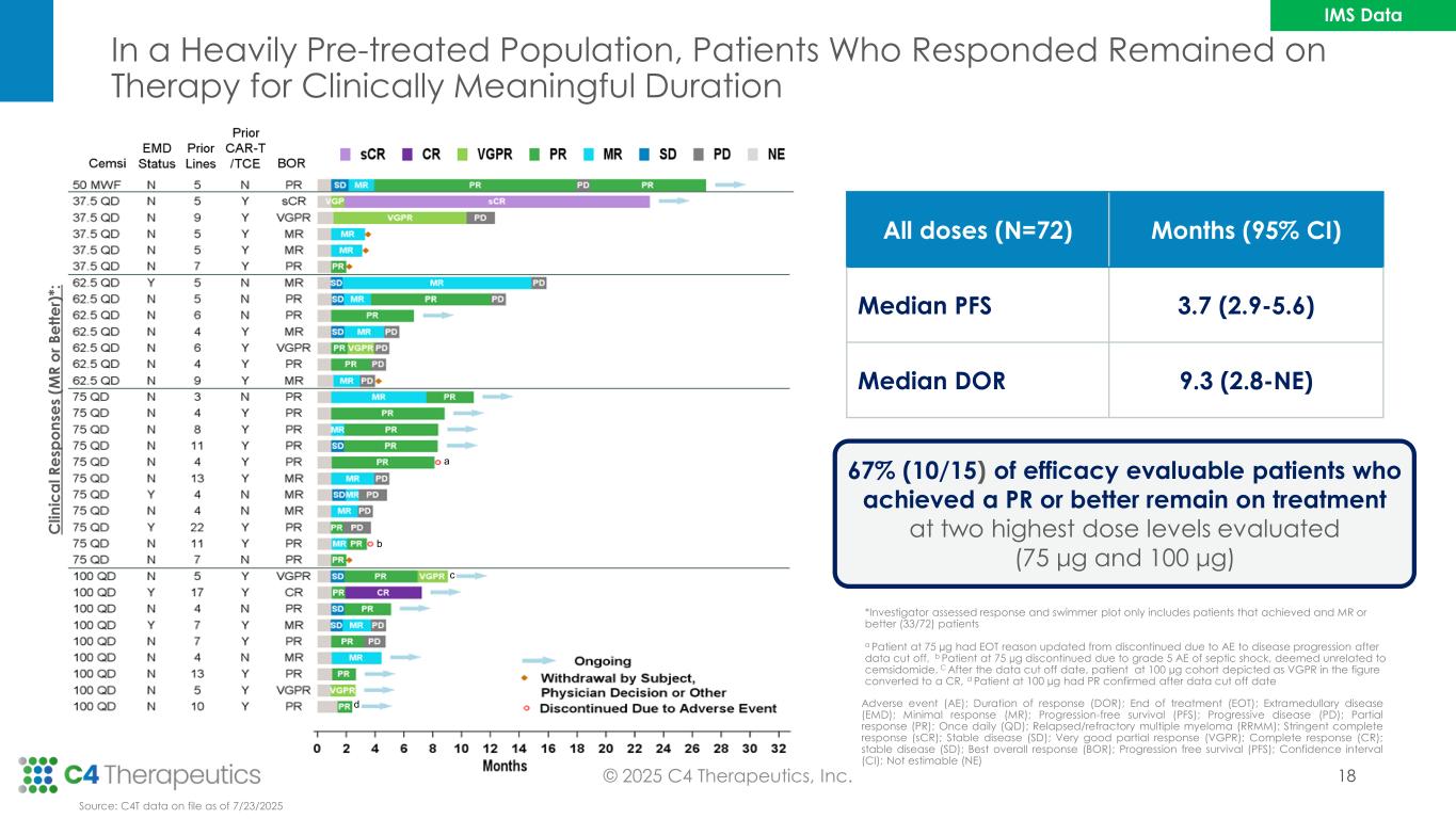 Class-leading Anti-myeloma Activity With a 40% and 50% ORR at the Two Highest Dose Levels 17 *Investigator assessed response a1 patient in the 37.5 µg cohort achieved a PR based on light chains, no follow up M protein available; §1patient at 62.5 µg did not have a post-baseline assessment and 4 patients in 100 µg did not have a post-baseline assessment performed at the time of data cutoff; #1 patient in 100 µg had a PR confirmed after data cut off date, which is reflected in the graph above Clinical benefit rate (CBR); Dexamethasone (dex); Minimal response (MR); Monday Wednesday Friday (MWF); Objective response rate (ORR); Progressive disease (PD); Partial response (PR); Once daily (QD); Relapsed/refractory multiple myeloma (RRMM); Stringent complete response (sCR); Stable disease (SD); Very good partial response (VGPR); Minimal residual disease MRD); Complete response (CR) Best Response: Multiple Myeloma – Cemsidomide 14/14 + Dex* 33% (2) 8% (1) 7% (1) 20% (4) 21% (3) 16% (11) 50% (3) 50% (6) 47% (7) 25% (5) 14% (2) 34% (23) 17% (2) 20% (3) 15% (3) 14% (2) 15% (10) 17% (1) 8% (1) 20% (3) 40% (8) 29% (4#) 25% (17) 8% (1) 7% (1) 14% (2) 6% (4) 7% (1) 1% (1)8% (1) 1% (1) 0% 25% 50% 75% 100% 50 µg MWF (N=6) 37.5 µg QD (N=12) 62.5 µg QD (N=15) 75 µg QD (N=20) 100 µg QD (N=14) TOTAL (N=67) B e s t R e s p o n s e % ( N ) sCR CR VGPR PR MR SD PD CBR 17% CBR 42% CBR 47% ORR 17% ORR 25% ORR 27% ORR 40% ORR 34% CBR 49% a CBR 55% ORR 50% CBR 64% §§ • ORR (≥ PR) of 34% (23/67) was achieved across all dose levels with a clinical benefit rate (≥ MR) of 49% • ORR at the highest dose level of cemsidomide (100 µg) was 50% with a clinical benefit rate of 64% • MRD negativity achieved in 1 patient with a CR at the highest dose level of cemsidomide (100 µg) Source: C4T data on file as of 7/23/2025 § 1 1As of September 5, 2025, at the 100 µg dose level: • One patient (not reflected in the graph) became efficacy evaluable and achieved a PR • One patient who was included in the table as a VGPR converted to a CR © 2025 C4 Therapeutics, Inc. IMS Data