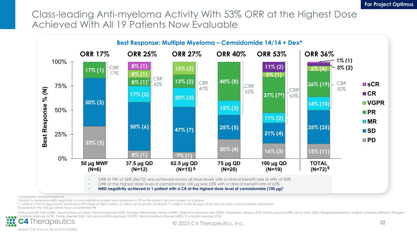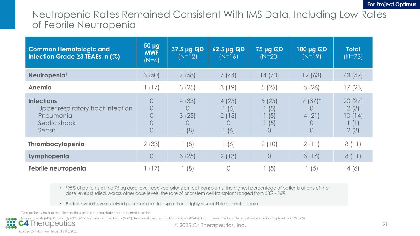 With 19 Patients Evaluable at the Highest Dose Level, Safety Profile and Anti-myeloma Activity Remain Consistent With IMS Data and Differentiated From Other IKZF1/3 Degraders 20© 2025 C4 Therapeutics, Inc. Cemsidomide + dex continued to be well-tolerated Across all doses, TEAEs were manageable • Dose reductions remained at 6% (4/73) • No discontinuations related to cemsidomide No additional febrile neutropenia events; two additional occurrences of grade ≥3 infections • One patient with viral pneumonia not related to cemsidomide • One patient who had chronic infections prior to starting study had a recurrent infection Neutropenia rate relatively consistent with IMS data • Updated grade 3/4 neutropenia is 63% (12/19) Class-leading anti-myeloma activity observed with 53% ORR at highest dose level 16% (3) 21% (4) 11% (2) 37% (7#) 5% (1) 11% (2) 0% 25% 50% 75% 100% 100 µg QD (N=19) sCR CR VGPR PR MR SD PD ORR 53% B e st R e sp o n se R a te At the 100 µg dose level: • One patient achieved an MRD negative CR1 • 84% (16/19) patients received prior CAR-T or T- cell engager therapy 1Unable to determine MRD negativity for one additional patient as the patient did not consent to a biopsy #2 patients in the 100 µg cohort have unconfirmed PR Clinical benefit rate (CBR); Dexamethasone (dex); Minimal response (MR); Objective response rate (ORR); Progressive disease (PD); Partial response (PR); Once daily (QD); Stringent complete response (sCR); Stable disease (SD); Very good partial response (VGPR); Minimal residual disease (MRD); Complete response (CR); International Myeloma Society Annual Meeting, September 2025 (IMS) Source: C4T data on file as of 9/10/2025 CBR 63% For Project Optimus Safety profile of 100 µg dose level unchanged: