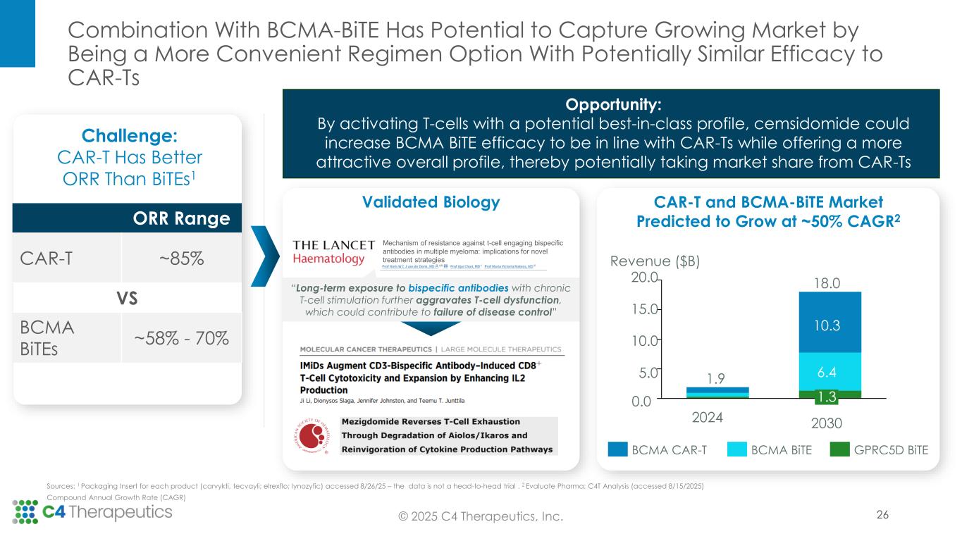 Multiple Myeloma Is a Growing Patient Population With Persistent Unmet Need as Patients Continue to Progress In the US, UK, and EU4, the addressable patient population in 2024 for: Majority of Patients Continue to Progress Despite Novel Treatment Options: MM Represents a Large and Growing Population With Tremendous Unmet Need • Many patients experience relapse after receiving a BCMA therapy - Despite high initial response rates, 2/3 of CARVYKTI- treated patients relapse before 5 years3 • Later lines are expected to grow as patients live longer on newer treatments but ultimately progress - Range of median OS for patients treated with BiTEs: 22 – 34 months4 Survival outcomes with current options are low1: 4L = ~42,0002 2L = ~56,0002 Sources: 1 Mammoth Study (275 patients evaluated across the study) Podar, K., & Leleu, X. (2021). Relapsed/Refractory Multiple Myeloma in 2020/2021 and Beyond. Cancers, 13(20), 5154 https://pmc.ncbi.nlm.nih.gov/articles/PMC6820050/ 2 EvaluatePharma (accessed 8/28/25) 3 Legend Biotech Press Release June 3, 2025 (https://investors.legendbiotech.com/news-releases/news-release-details/legend-biotech-unveils-groundbreaking-5-year-survival-data) 4 https://www.jnjmedicalconnect.com/media/attestation/congresses/oncology/2024/ims/longterm-followup-from-the-phase-12-majestec1-trial-of-teclistamab-in-patients-with-relapsedrefracto.pdf; https://www.pfizer.com/news/press-release/press-release- detail/elrexfiotm-shows-median-overall-survival-more-two-years ; https://www.jnjmedicalconnect.com/products/talvey/medical-content/talvey-monumental1-mmy1001-study Overall Survival (OS); Germany, Italy, France, and Spain (EU4) Median OS in RRMM (penta-refractory) ~5.6 months Median OS (triple/quad refractory) ~9.2 months 25© 2025 C4 Therapeutics, Inc.