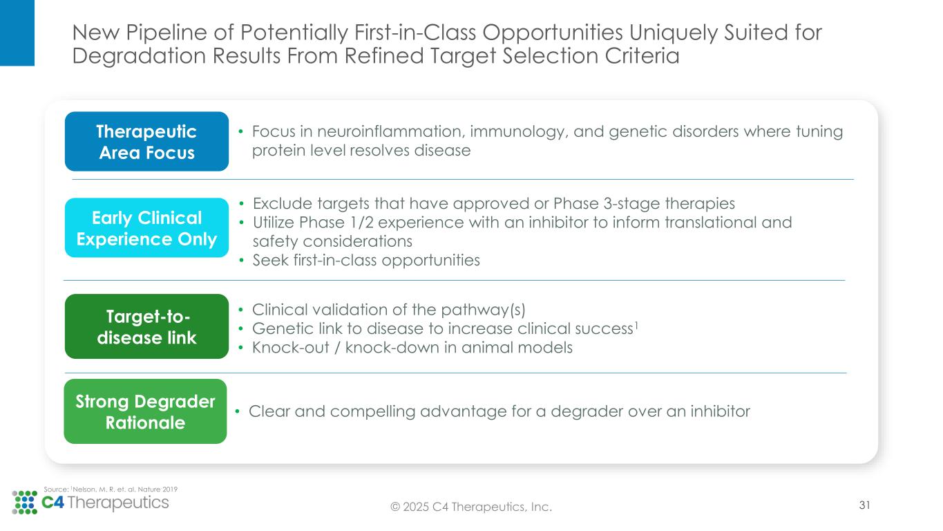 New C4T Discovery Strategy Based on Learnings From ~10 Years of TPD Experience 1 Examples include immunology, neuroinflammation / neurodegeneration • Choose therapeutic areas1 where normalization of protein levels or function is required • The kinetics of degraders can be fine-tuned for precise and maximal efficacy 3 Organizations took TPD modality risk and avoided biology risk by selecting validated targets, but they require head-to-head clinical data to differentiate from inhibitors 4 Degraders can achieve CNS exposures and outperform small molecules in the brain Oncology pathways require deep degradation to facilitate pathway blockade, which creates a very high bar for TPD modality to deliver efficacy 1 2 A differentiating feature of TPD is the ability to tune degradation to defined levels • Select targets in validated pathways with first-in- class potential that could uniquely be unlocked by a degrader • Mitigate target risk by requiring a sentinel indication for early clinical validation and growing value through indication expansion • Pursue clinically validated inflammatory pathways central to brain inflammation where use of biologics fails to meet patient needs Observations from 1st Generation Degraders C4T Strategic Adjustments to Leverage Degraders 30© 2025 C4 Therapeutics, Inc.