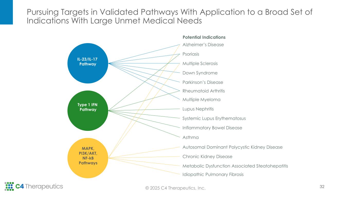 New Pipeline of Potentially First-in-Class Opportunities Uniquely Suited for Degradation Results From Refined Target Selection Criteria • Exclude targets that have approved or Phase 3-stage therapies • Utilize Phase 1/2 experience with an inhibitor to inform translational and safety considerations • Seek first-in-class opportunities Early Clinical Experience Only • Clinical validation of the pathway(s) • Genetic link to disease to increase clinical success1 • Knock-out / knock-down in animal models Target-to- disease link • Clear and compelling advantage for a degrader over an inhibitor Strong Degrader Rationale • Focus in neuroinflammation, immunology, and genetic disorders where tuning protein level resolves disease Therapeutic Area Focus Source: 1Nelson, M. R. et. al. Nature 2019 © 2025 C4 Therapeutics, Inc. 31