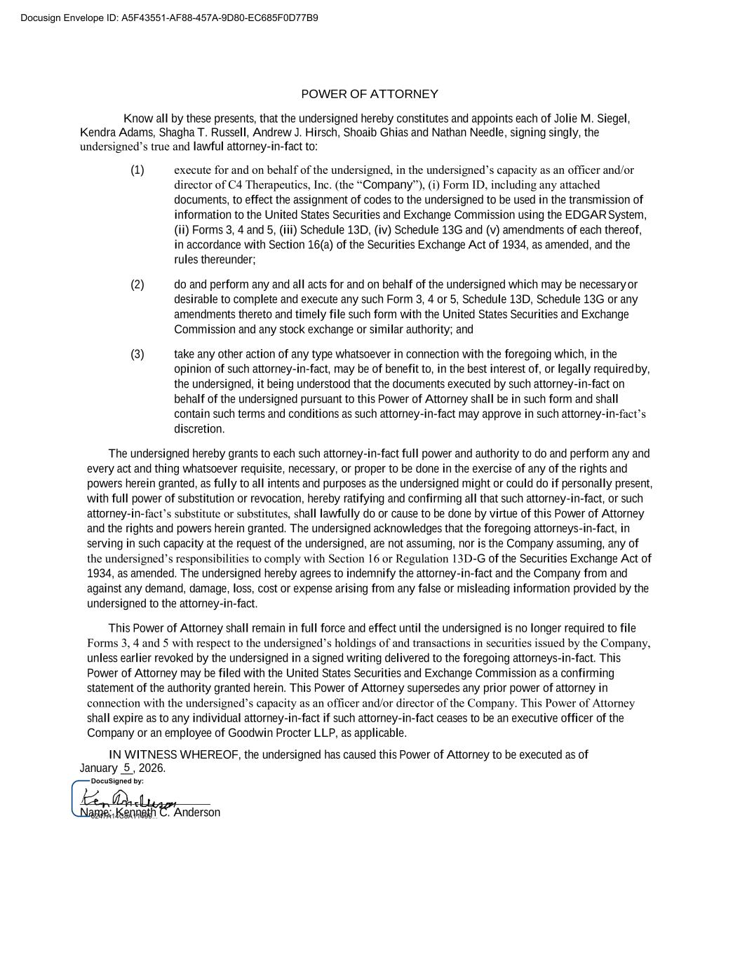 POWER OF ATTORNEY Know all by these presents, that the undersigned hereby constitutes and appoints each of Jolie M. Siegel, Kendra Adams, Shagha T. Russell, Andrew J. Hirsch, Shoaib Ghias and Nathan Needle, signing singly, the undersigned’s true and lawful attorney-in-fact to: (1) execute for and on behalf of the undersigned, in the undersigned’s capacity as an officer and/or director of C4 Therapeutics, Inc. (the “Company”), (i) Form ID, including any attached documents, to effect the assignment of codes to the undersigned to be used in the transmission of information to the United States Securities and Exchange Commission using the EDGAR System, (ii) Forms 3, 4 and 5, (iii) Schedule 13D, (iv) Schedule 13G and (v) amendments of each thereof, in accordance with Section 16(a) of the Securities Exchange Act of 1934, as amended, and the rules thereunder; (2) do and perform any and all acts for and on behalf of the undersigned which may be necessary or desirable to complete and execute any such Form 3, 4 or 5, Schedule 13D, Schedule 13G or any amendments thereto and timely file such form with the United States Securities and Exchange Commission and any stock exchange or similar authority; and (3) take any other action of any type whatsoever in connection with the foregoing which, in the opinion of such attorney-in-fact, may be of benefit to, in the best interest of, or legally required by, the undersigned, it being understood that the documents executed by such attorney-in-fact on behalf of the undersigned pursuant to this Power of Attorney shall be in such form and shall contain such terms and conditions as such attorney-in-fact may approve in such attorney-in-fact’s discretion. The undersigned hereby grants to each such attorney-in-fact full power and authority to do and perform any and every act and thing whatsoever requisite, necessary, or proper to be done in the exercise of any of the rights and powers herein granted, as fully to all intents and purposes as the undersigned might or could do if personally present, with full power of substitution or revocation, hereby ratifying and confirming all that such attorney-in-fact, or such attorney-in-fact’s substitute or substitutes, shall lawfully do or cause to be done by virtue of this Power of Attorney and the rights and powers herein granted. The undersigned acknowledges that the foregoing attorneys-in-fact, in serving in such capacity at the request of the undersigned, are not assuming, nor is the Company assuming, any of the undersigned’s responsibilities to comply with Section 16 or Regulation 13D-G of the Securities Exchange Act of 1934, as amended. The undersigned hereby agrees to indemnify the attorney-in-fact and the Company from and against any demand, damage, loss, cost or expense arising from any false or misleading information provided by the undersigned to the attorney-in-fact. This Power of Attorney shall remain in full force and effect until the undersigned is no longer required to file Forms 3, 4 and 5 with respect to the undersigned’s holdings of and transactions in securities issued by the Company, unless earlier revoked by the undersigned in a signed writing delivered to the foregoing attorneys-in-fact. This Power of Attorney may be filed with the United States Securities and Exchange Commission as a confirming statement of the authority granted herein. This Power of Attorney supersedes any prior power of attorney in connection with the undersigned’s capacity as an officer and/or director of the Company. This Power of Attorney shall expire as to any individual attorney-in-fact if such attorney-in-fact ceases to be an executive officer of the Company or an employee of Goodwin Procter LLP, as applicable. IN WITNESS WHEREOF, the undersigned has caused this Power of Attorney to be executed as of January __, 2026. Name: Kenneth C. Anderson Docusign Envelope ID: A5F43551-AF88-457A-9D80-EC685F0D77B9 5